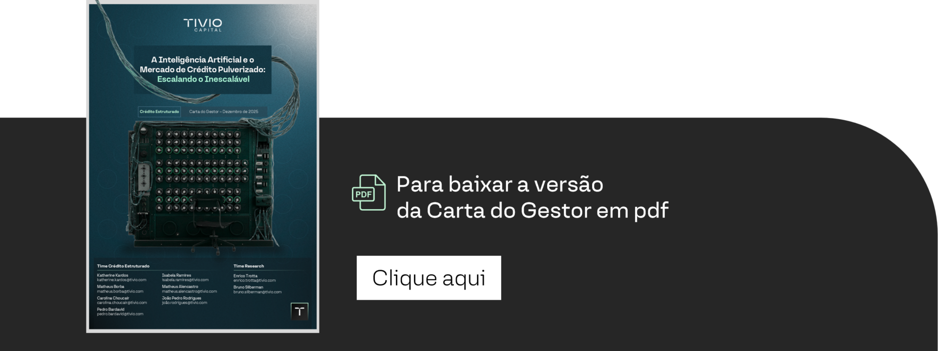 Na Tivio Capital, acreditamos que essa revolução reforça o valor da gestão ativa em crédito. Nossas análises têm se aprofundado cada vez mais nas evoluções dos processos, para permitir que possamos tanto ter gestão mais eficientes dos portfólios, quanto investir nos players que lideram essa corrida em nichos específicos do mercado que atuamos. Assim como a previsão de Turing sobre máquinas inteligentes discretamente antecipava, a IA no crédito quebra barreiras, criando cada vez mais capilaridade nas ofertas de créditos menores. Diante desse cenário de transformação impulsionado pela inteligência artificial e pela busca constante por eficiência e inovação no mercado de crédito estruturado, o fundo Alt 180 se posiciona como uma solução para investidores que buscam retornos superiores com gestão ativa e criteriosa. Ao combinar originação proprietária, estruturação robusta e foco em garantias reais, o Alt 180 aproveita as oportunidades geradas por mudanças tecnológicas e regulatórias, oferecendo flexibilidade para navegar por diferentes segmentos e capturar valor em operações de crédito com perfil de risco ajustado. Seguimos comprometidos em entregar resultados consistentes e transparentes, alinhando nossa estratégia à evolução do mercado e às necessidades dos nossos investidores.