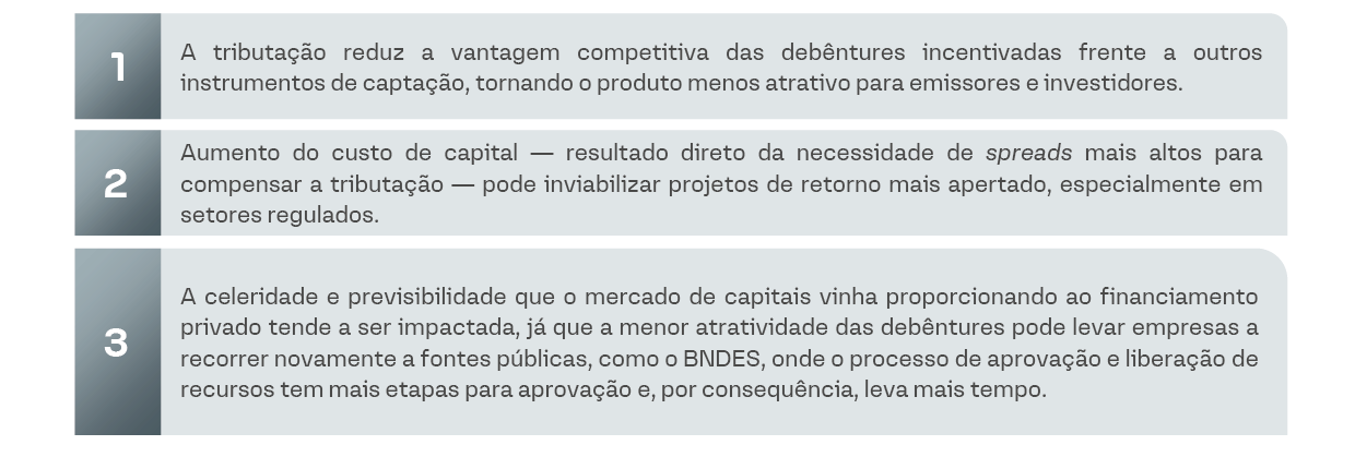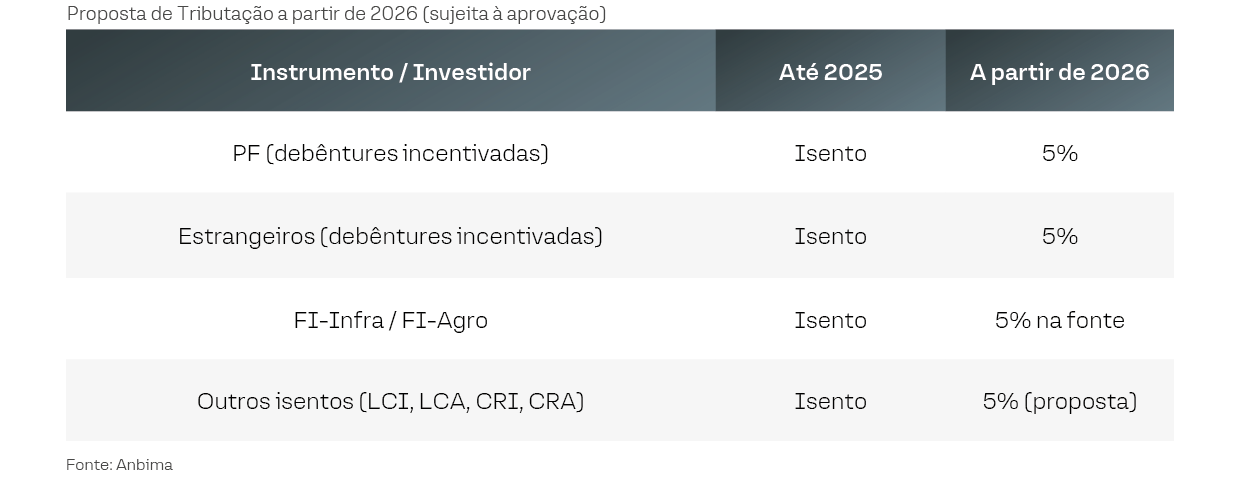 Caso a nova regra seja aprovada, a isenção poderá ser revogada para novas emissões, e os rendimentos passarão a ser tributados. Para pessoas físicas, a MP propõe uma alíquota única de 5% de IR sobre os rendimentos (em vez da isenção total). A tributação impacta não só as debêntures incentivadas, mas alcança outros instrumentos isentos, como LCIs, LCAs, CRIs e CRAs.