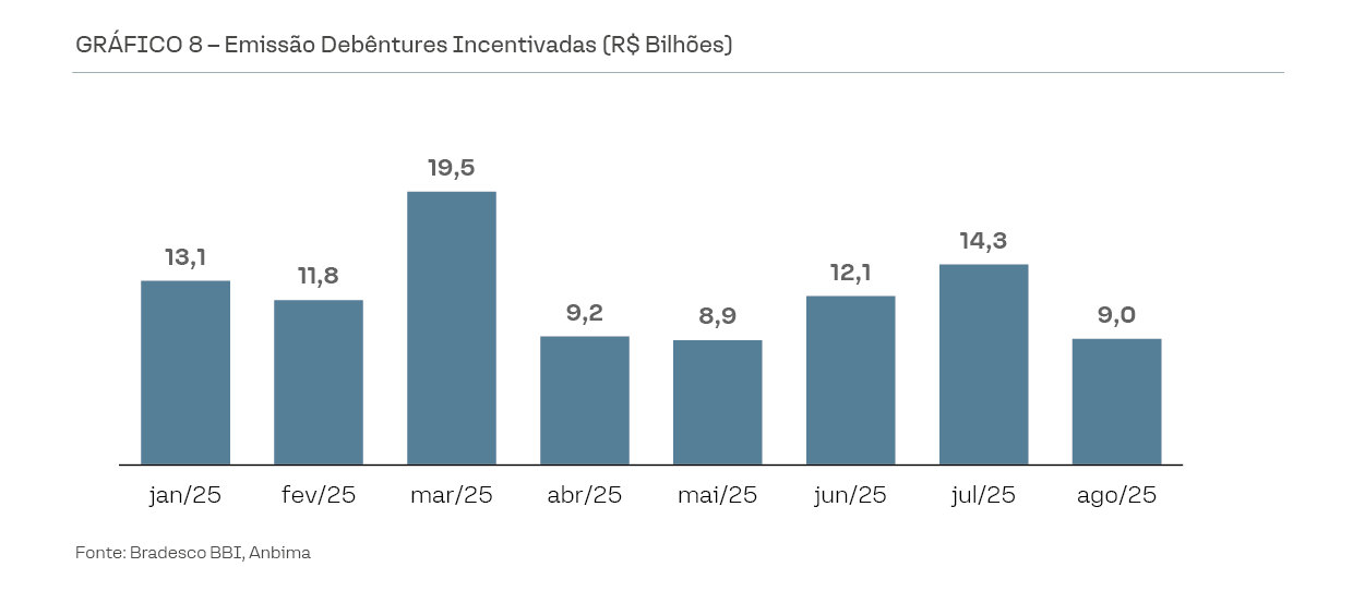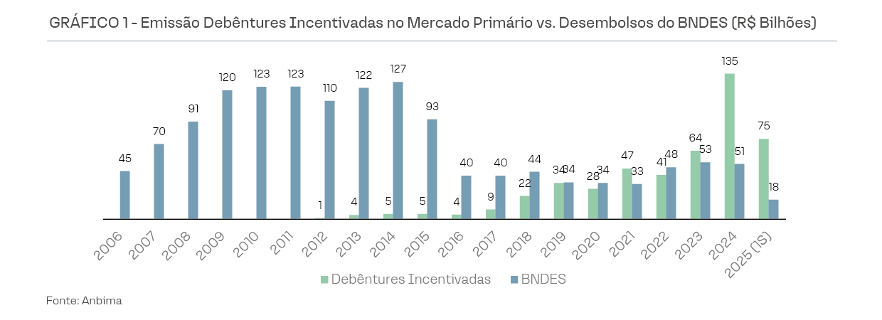 Esse crescimento reflete uma mudança de paradigma: o financiamento de longo prazo, antes concentrado no BNDES e em bancos públicos, passou a ser cada vez mais suprido pelo mercado de capitais. Dados recentes mostram que, enquanto o BNDES respondeu por cerca de 21% das emissões de debêntures incentivadas para infraestrutura em 2024, a maior parte dos recursos já é originada diretamente de investidores privados, nacionais e estrangeiros. O recorde histórico de emissões de debêntures incentivadas em 2024 foi ainda potencializado por uma combinação adicional de fatores: restrição à oferta de outros títulos isentos de IR, como CRIs e CRAs, somado a um cenário macroeconômico favorável à renda fixa.