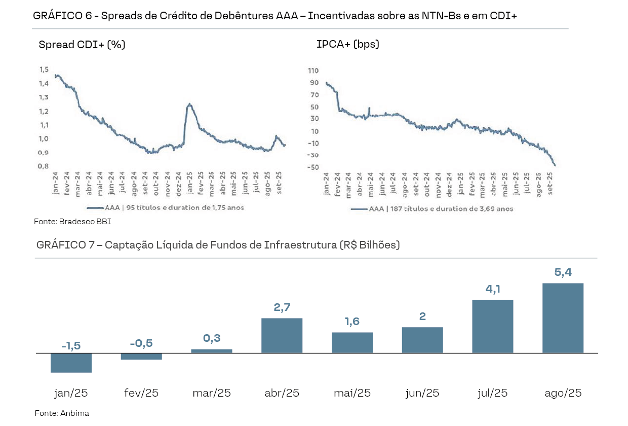 A possível mudança na tributação das debêntures incentivadas, prevista para emissões a partir de 2026, já está provocando também uma reprecificação relevante no mercado. Desde o anúncio da Medida Provisória 1.303/2025, houve uma corrida por ativos isentos, levando os spreads das debêntures incentivadas a mínimas históricas – em alguns casos, próximos de zero ou até negativos em relação à NTN-B, especialmente para papéis AAA e de setores de infraestrutura mais maduros.
