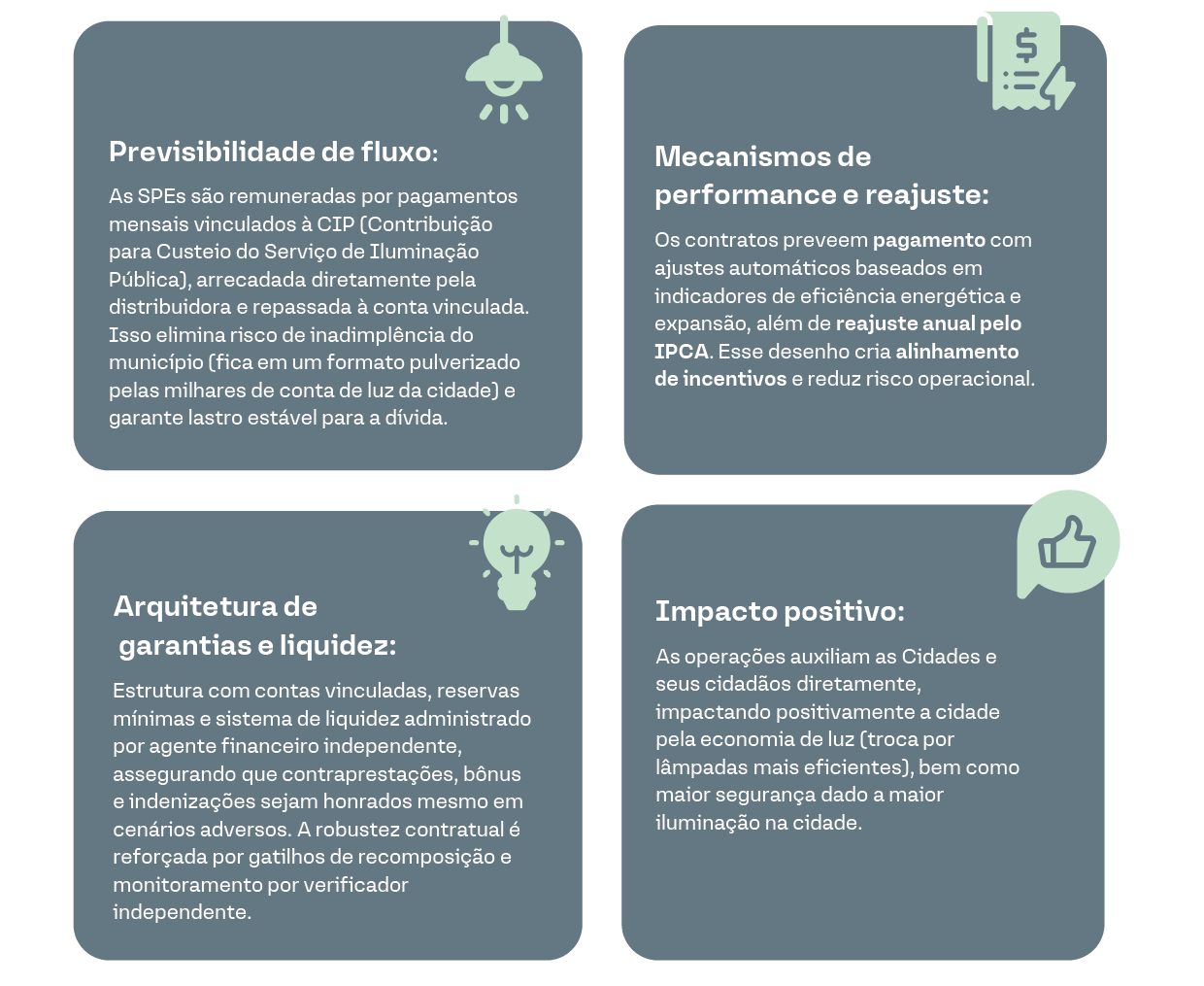 Nesse cenário, acreditamos que uma forma objetiva e segura de se diferenciar é por meio da originação e estruturação proprietária das operações. Esse modelo de atuação permite encontrar ativos com uma relação risco-retorno mais adequada, ao mesmo tempo em que dá ao originador maior capacidade de definir proteções contratuais (covenants financeiros, garantias reais, contas‑reserva, step‑ups de taxa, cláusulas de vencimentos antecipado, etc.) que mitigam o risco de crédito e preservam valor ao longo do ciclo do projeto. Em suma, quando a casa lidera a originação/estruturação, ela captura a assimetria de informação, melhora o alinhamento de incentivos entre emissor e investidores e acrescenta um prêmio pela baixa competividade do lado da demanda nesses projetos.