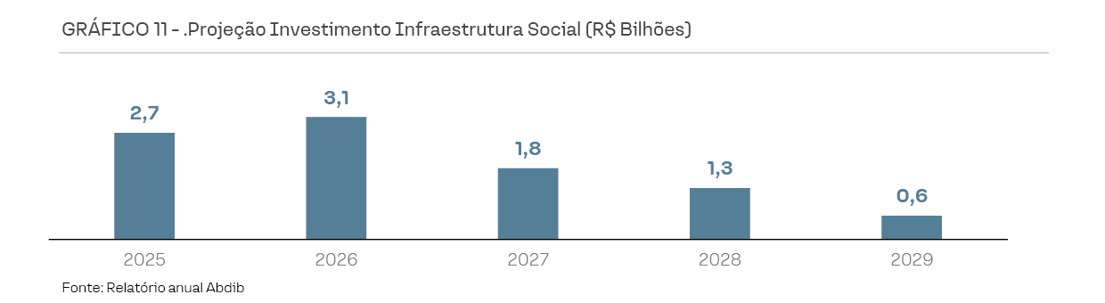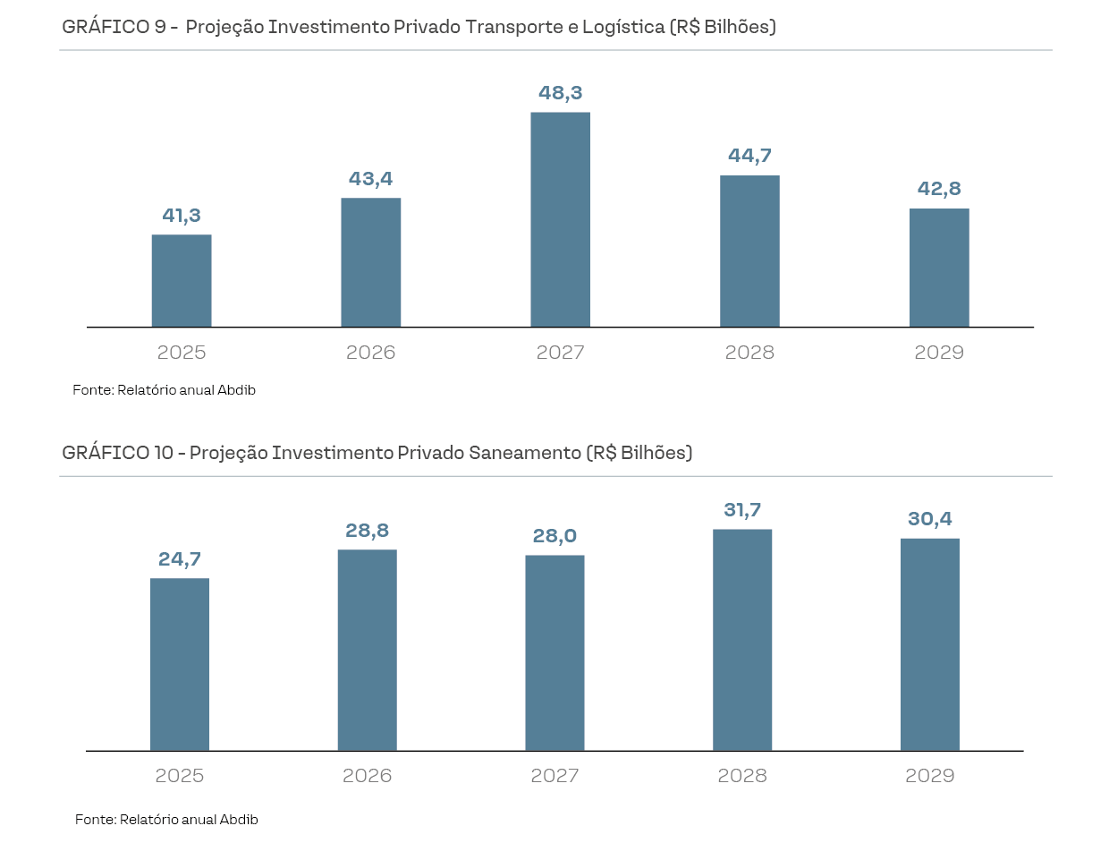 Projeções da ABDIB mostram um nível de investimentos privados em infraestrutura relevante nos próximos anos, com destaque para os setores de transporte e logística (rodovias, portos, etc.), saneamento e energia. No entanto, caso a mudança tributária se concretize, deve atuar como um detrator dessas projeções de investimentos.