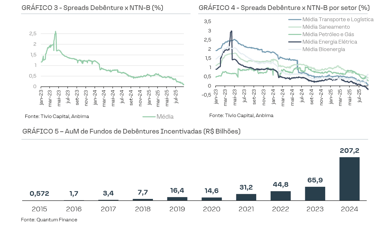 Além do impacto direto no financiamento de projetos, as debêntures incentivadas se consolidaram como um ativo central na composição dos portfólios de fundos de investimento, seguradoras, e investidores individuais. A atratividade desse instrumento decorre principalmente da combinação entre isenção tributária, duration longa e indexação ao IPCA, características que se alinham ao perfil de investidores de longo prazo . Esse cenário estimulou uma verdadeira proliferação de fundos de investimento dedicados a debêntures de infraestrutura, ampliando ainda mais a base de compradores e contribuindo para o aumento expressivo da demanda por esses papéis. Como consequência, observou-se uma compressão significativa dos spreads de crédito das debêntures incentivadas, que atingiram patamares historicamente baixos, refletindo o forte apetite do mercado por ativos isentos e de qualidade.