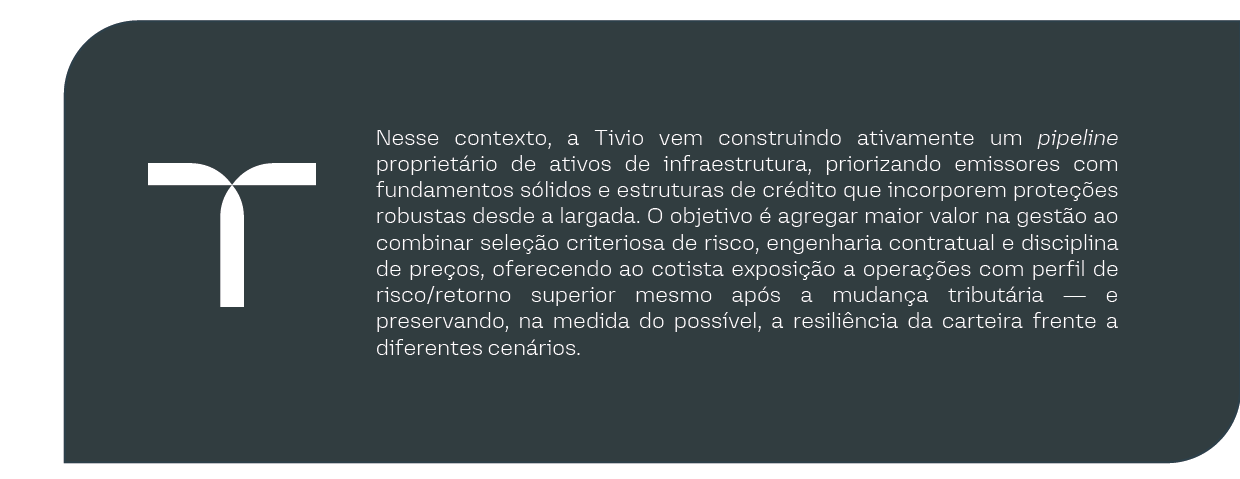 Para navegar essa janela de oportunidades e desafios, destacamos os fundos de infraestrutura da Tivio como soluções estratégicas para investidores que buscam exposição qualificada ao setor. O Tivio Infra Plus, indexado ao IPCA, oferecendo exposição à debentures incentivadas por meio de empresas e projetos com robusto risco de crédito – para mais informações sobre este fundo, confira o anexo com o relatório de gestão.