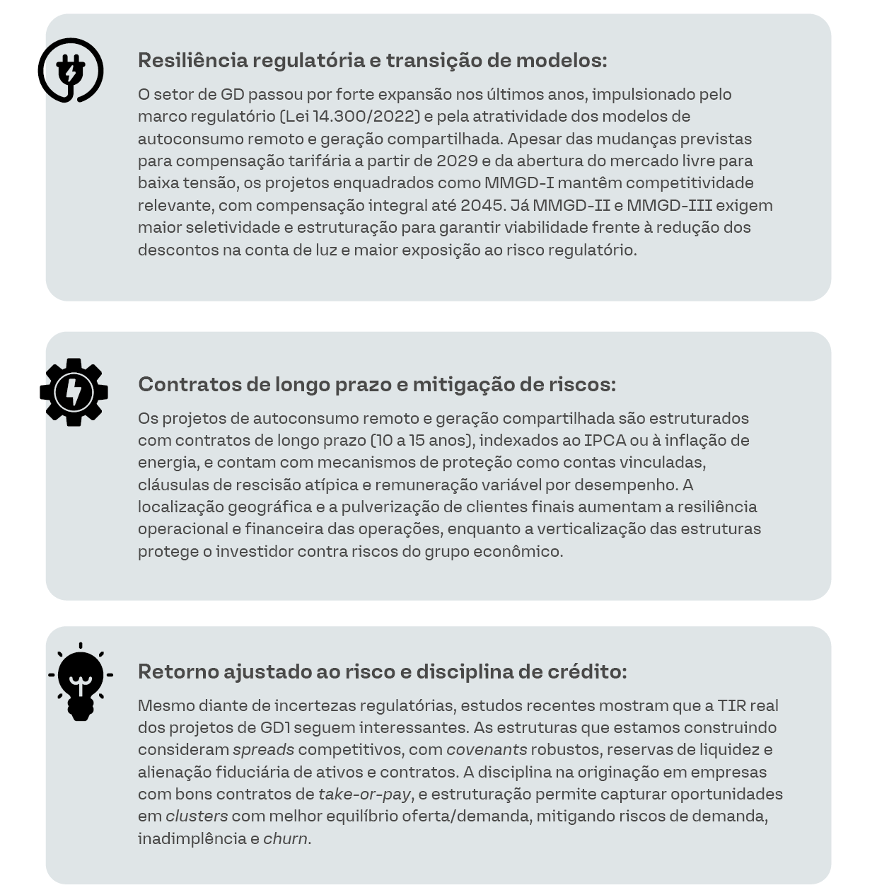 Os projetos de GD no pipeline da Tivio representam uma combinação única de contratos longos, diversificação estrutural, resiliência regulatória e retorno ajustado ao risco, atributos essenciais para navegar o ciclo pós-isenção e capturar valor em um ambiente de spreads reprecificados e maior seletividade de crédito.