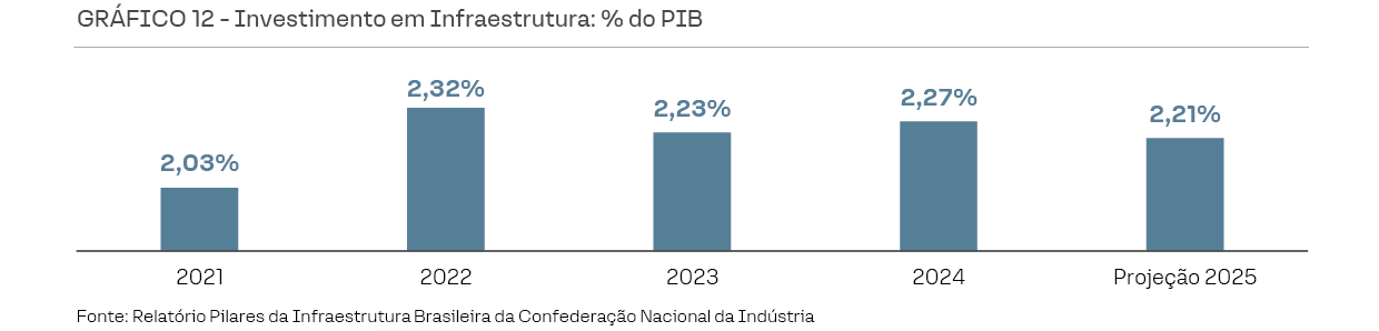 Por fim, destacamos que a eventual concretização desse cenário de desaceleração é preocupante para as perspectivas de crescimento do país, que já convive com um déficit relevante de investimento em infraestrutura. O gap de investimento, que já limita o crescimento econômico e a competitividade do Brasil, tende a se ampliar caso o fluxo de capital privado para o setor seja afetado por mudanças regulatórias que elevem o custo e dificultem o acesso ao financiamento.