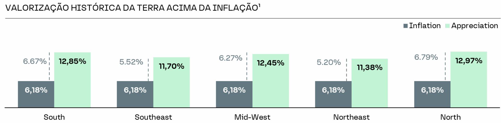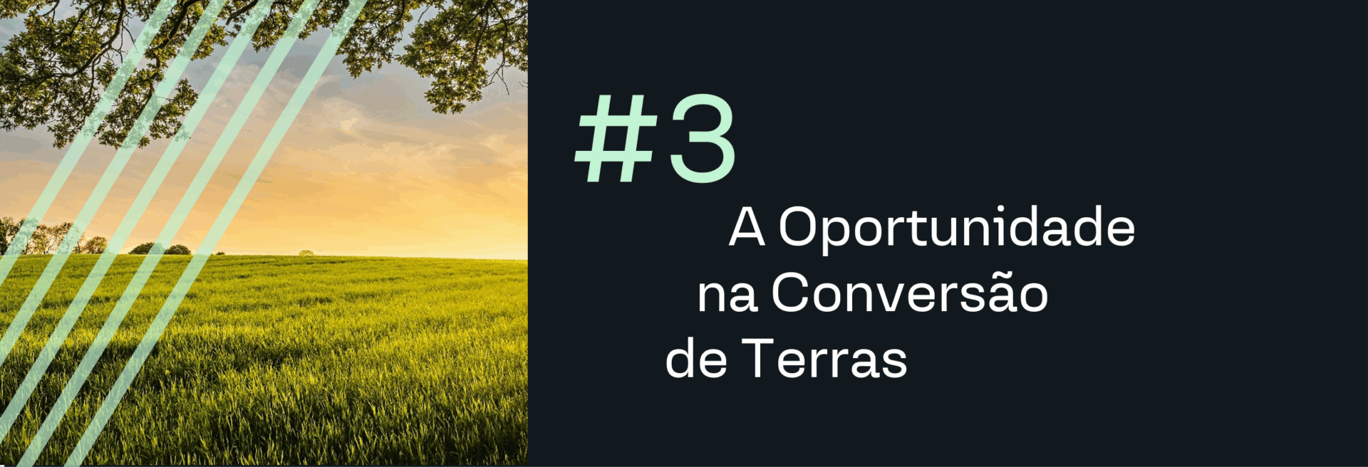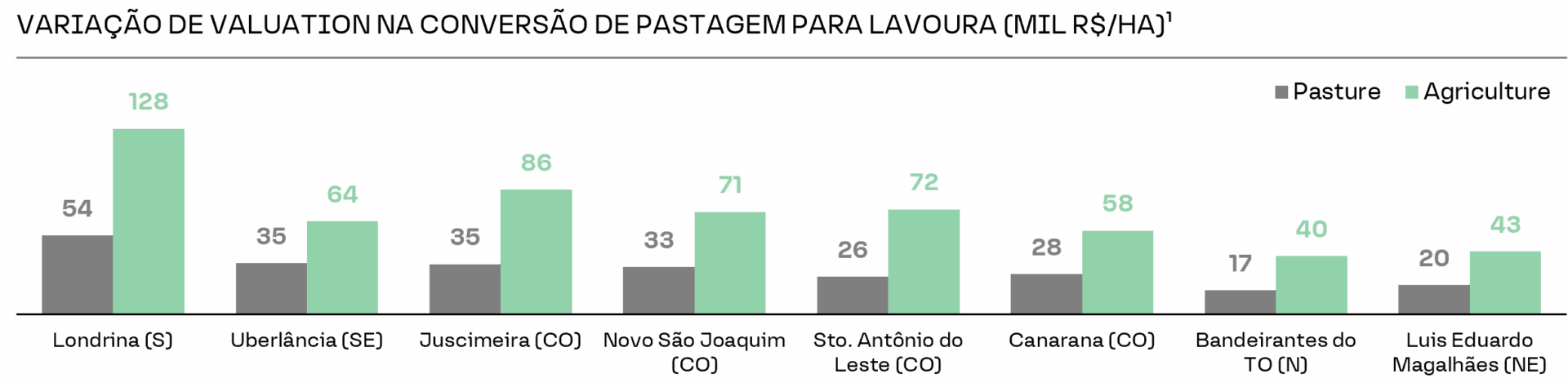 A conversão também cria arbitragem patrimonial pela reclassificação do ativo fundiário. Além da valorização intrínseca, existe uma oportunidade de arbitragem criada pela conversão de pastagens em todas as regiões do Brasil, potencializando ganhos reais no valor das terras. Apesar de ser um dos fatores mais importantes, a valorização do ativo fundiário ao longo desse processo costuma ser subestimada.