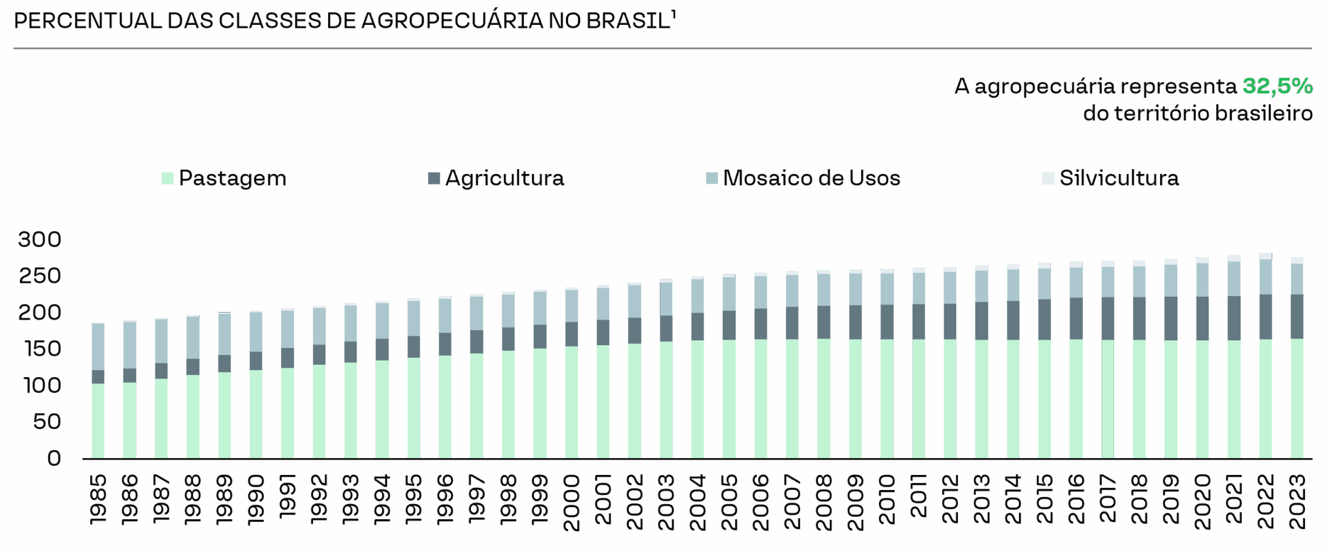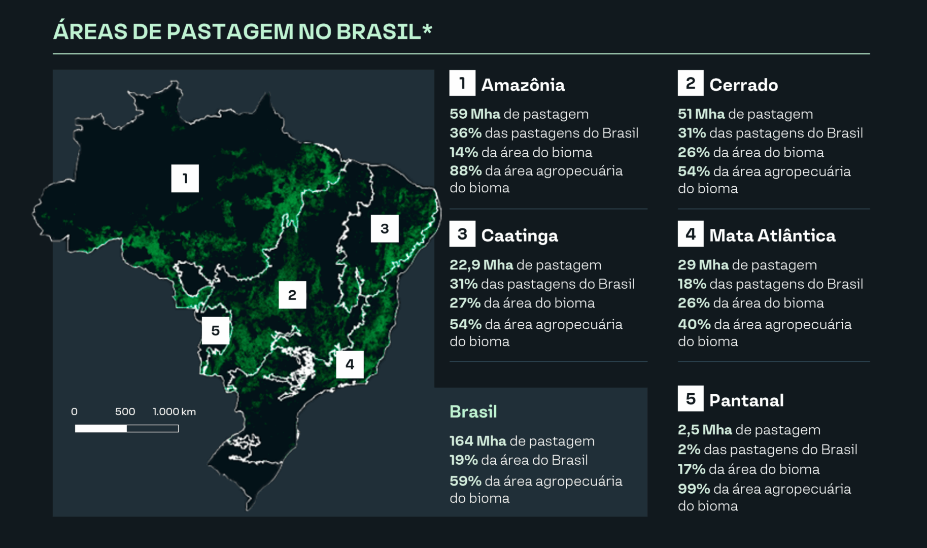 O Brasil impressiona pela extensão do território ocupado pela agropecuária: cerca de 1 em cada 3 hectares nacionais são dedicados ao setor. Dentro desse território agro, as pastagens (terras destinadas ao gado) se destacam com 164,57 Mha (59,48% da área agropecuária). Esses ~164 milhões de hectares de pastagens estão distribuídos por diferentes biomas – Cerrado, Amazônia, Mata Atlântica, Caatinga e Pampa – cada qual com características únicas que influenciam diretamente a produtividade e as condições gerais das pastagens.
