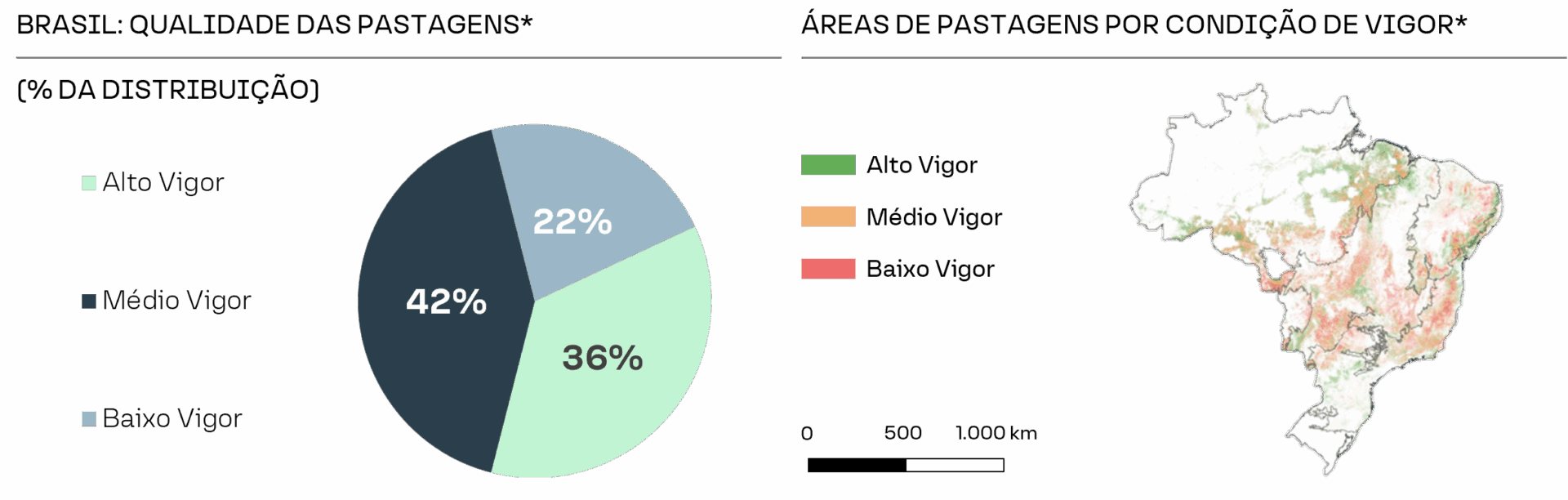A degradação das pastagens implica em múltiplos efeitos negativos. A degradação resulta em queda na produtividade, aumento dos custos operacionais e redução da rentabilidade das atividades rurais. Além disso, a intensidade da degradação não é homogênea. Biomas como Cerrado e regiões do Norte convivem com faixas expressivas de pastagens degradadas, enquanto estados como Mato Grosso, Minas Gerais, Bahia e Mato Grosso do Sul se destacam pelo volume absoluto de hectares comprometidos. De acordo com a MapBiomas, 78% das pastagens brasileiras são consideradas de baixo-médio vigor (i.e., vigor refere-se à capacidade do solo de sustentar o crescimento vigoroso das plantas).