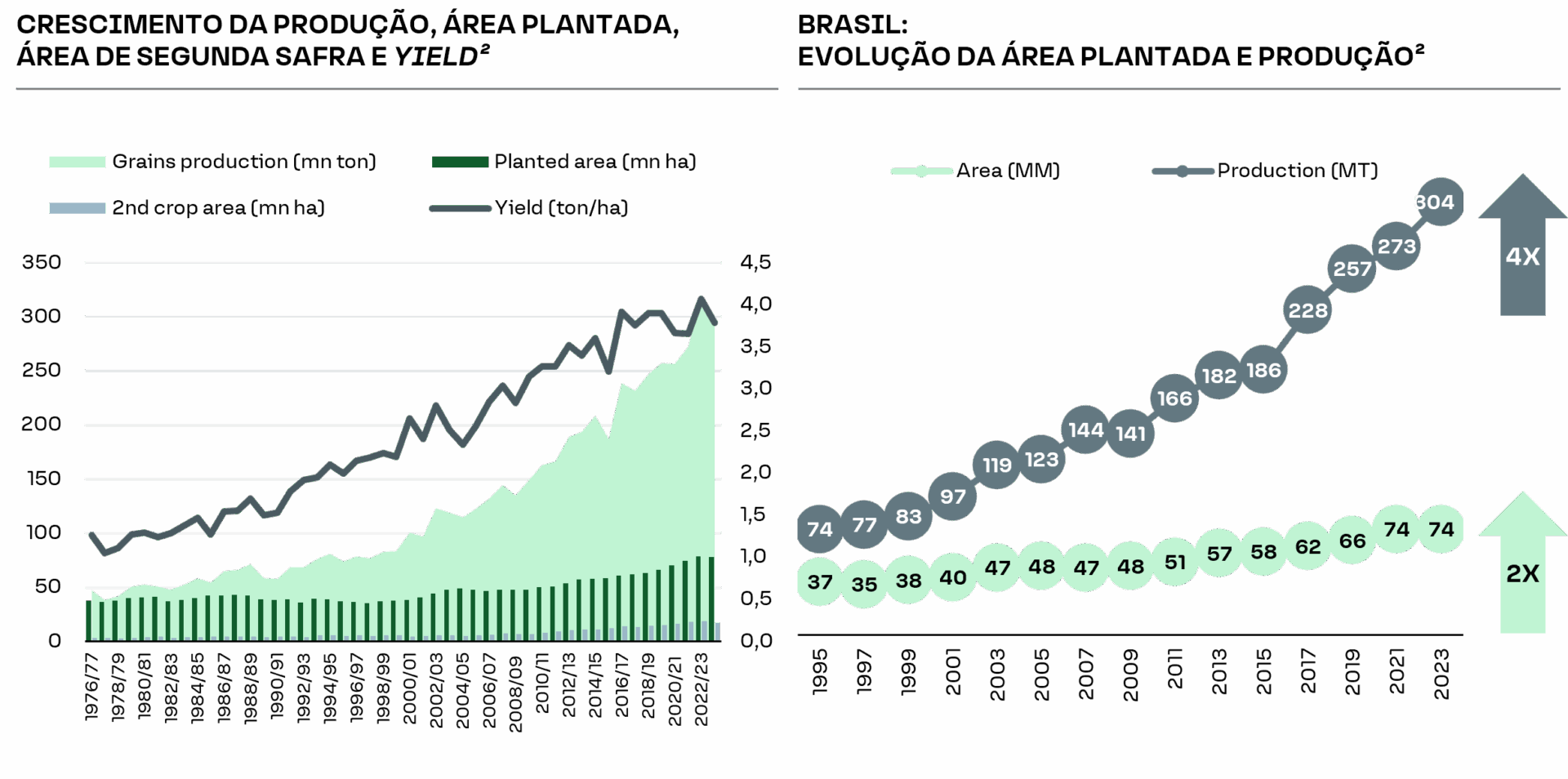 Os gráficos abaixo mostram a evolução da área plantada, bem como o crescimento da produção, da área de segunda safra e do yield.
