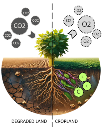 Perda de carbono do solo: a menor biomassa radicular e a redução da matéria orgânica resultam na liberação de CO₂ antes estocado.