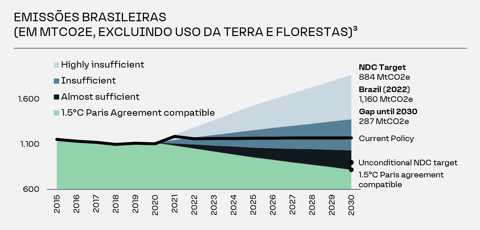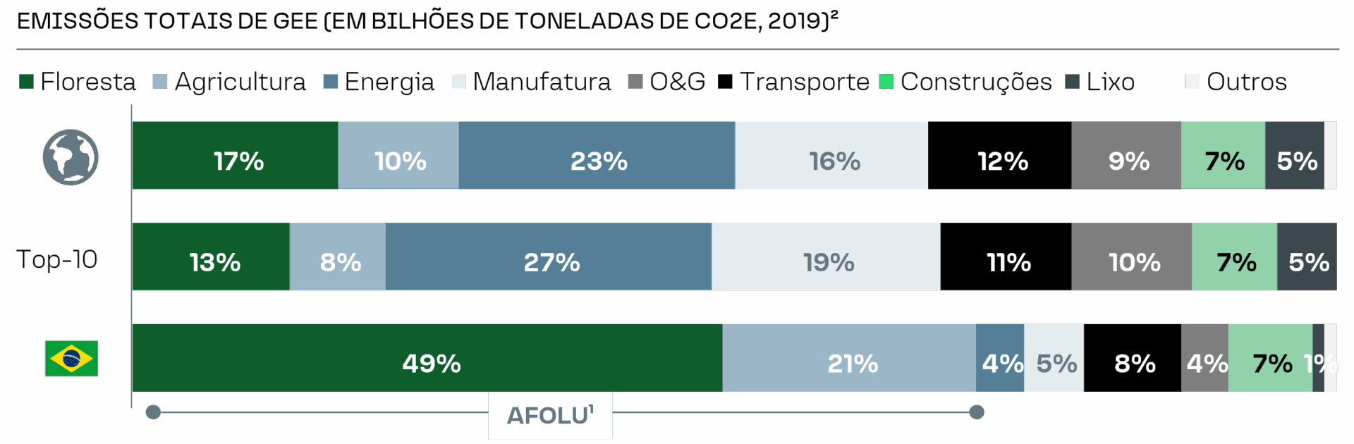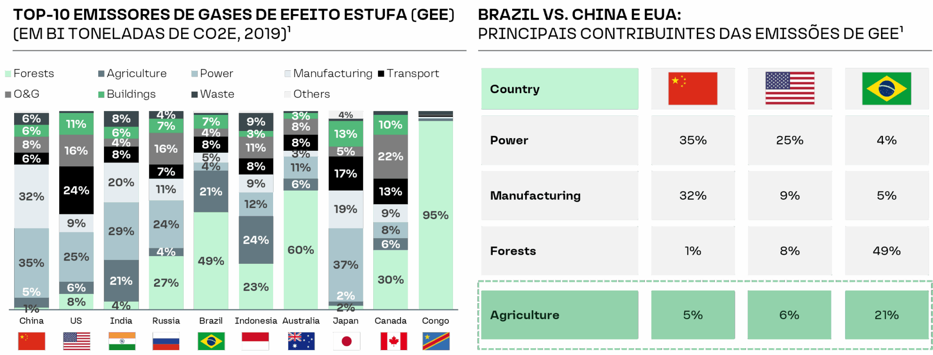 O Brasil atualmente é o 5º maior emissor de Gases de Efeito Estufa (GEE) e suas políticas climáticas estão aquém das metas globais de redução de emissões. Como referência, o agronegócio é responsável por cerca de 21% das emissões de GEE no Brasil. Em comparação, a participação do agro nas emissões de GEE é de 10% a nível global, enquanto na China e nos EUA representa 5% a 6%. As emissões classificadas como forests, correspondem a mudanças no uso da terra, desmatamento e queimadas. No Brasil, grande parte desse desmatamento decorre da expansão da agropecuária, o que, na prática, eleva ainda mais o peso real do setor nas emissões totais.