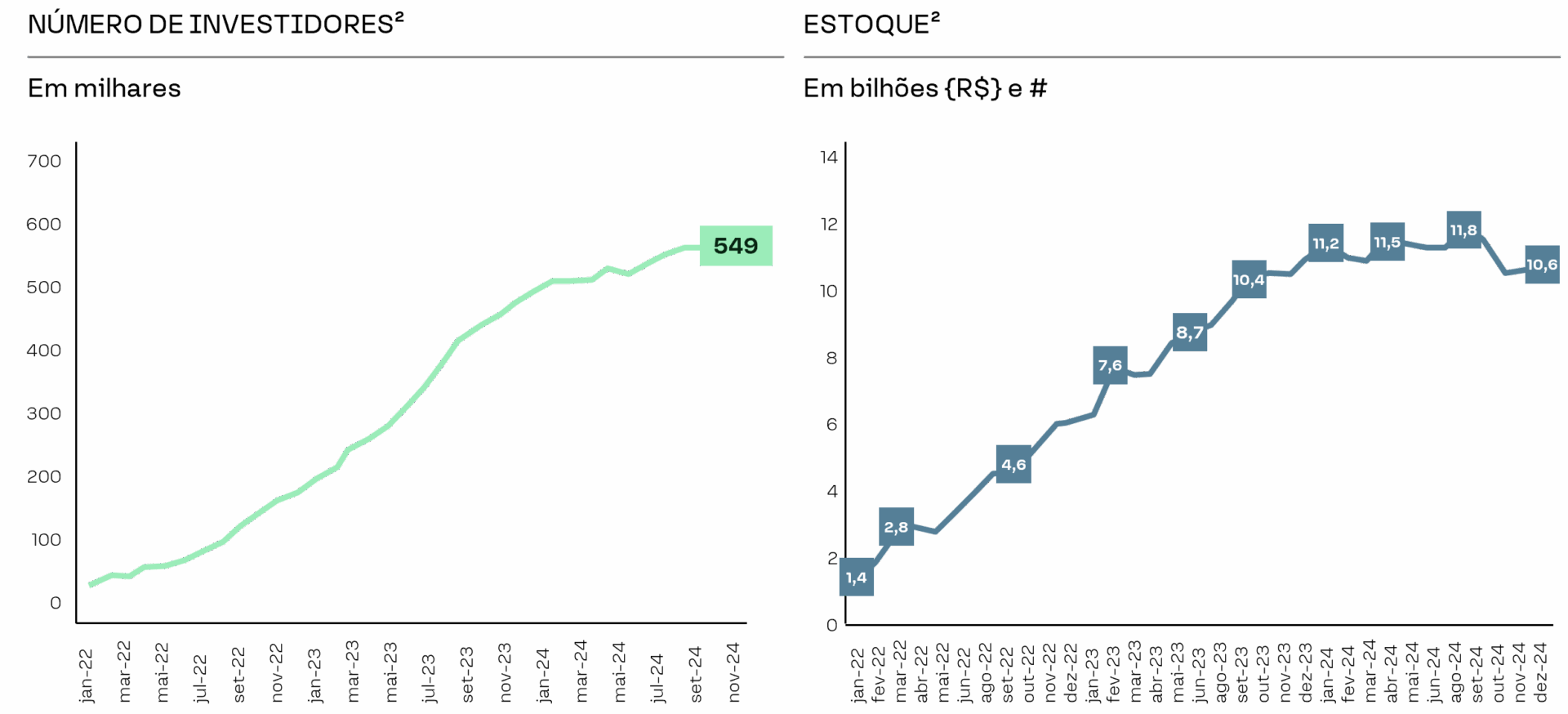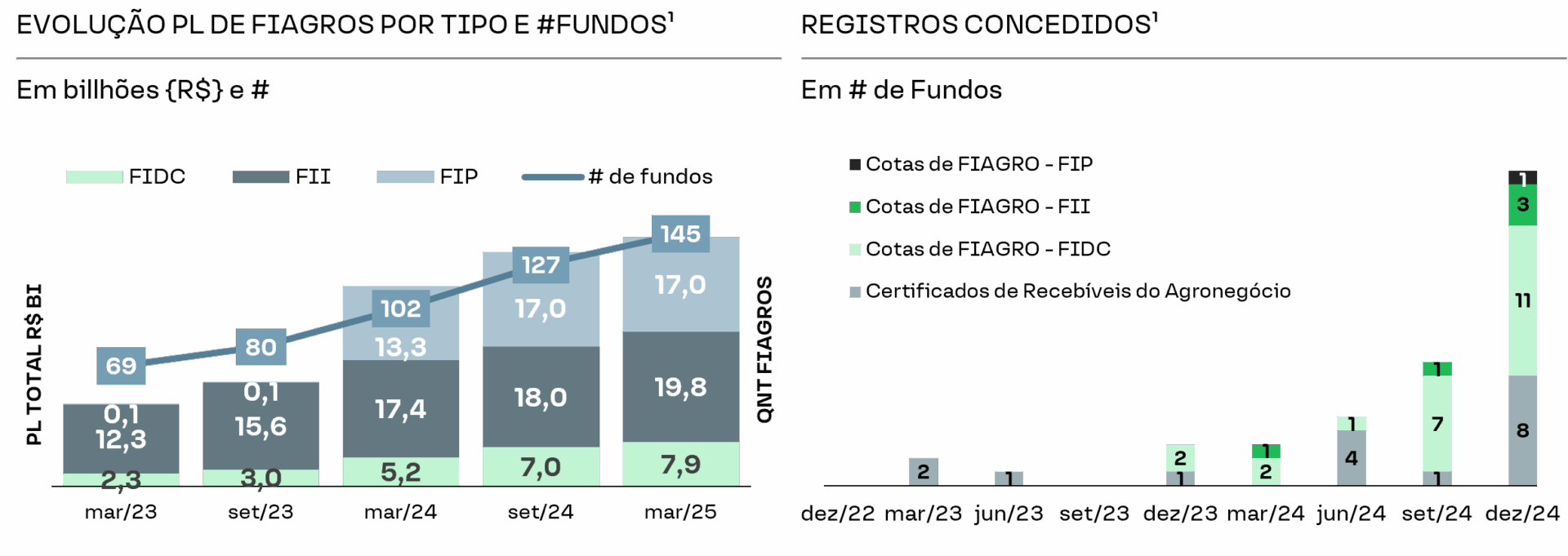No segmento de FIAGROs listados, o número de investimentos também expandiu fortemente desde a criação do veículo. Apesar de ainda o veículo possuir menor penetração nos investidores quando comparado ao tradicional fundo imobiliário (FII), o número de investidores em FIAGROs listados totaliza 549 mil, com o estoque da indústria totalizando R$ 10,6 bilhões (ou crescimento de 93,6% ao ano desde 2022). Como referência, a indústria de fundos imobiliários listados (FIIs) possui cerca de 3 milhões de investidores e R$ 365 bi em estoque.