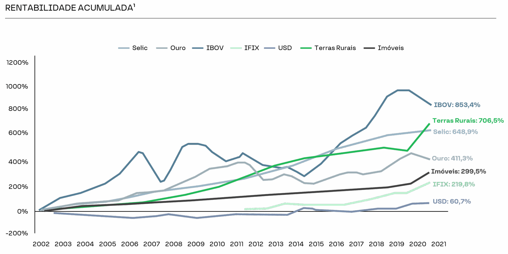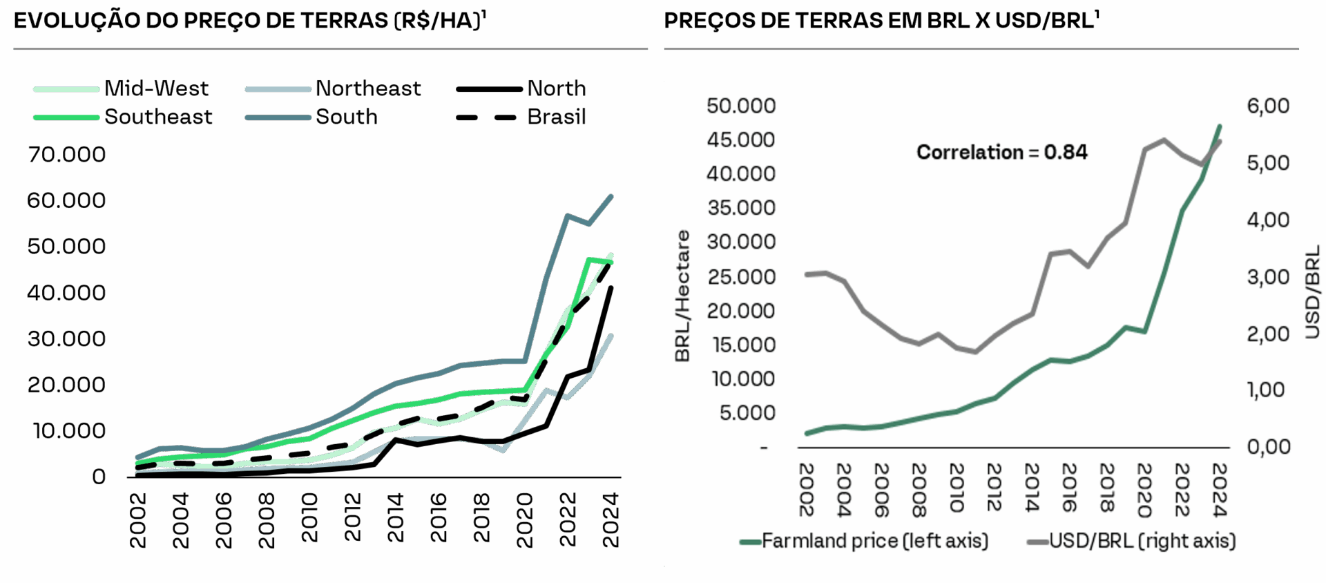 Hedge natural: no Brasil, historicamente, as terras funcionam como um hedge natural frente à valorização do dólar sobre o real. Apesar de não oferecerem a mesma liquidez de outros ativos financeiros, as terras são bens tangíveis, de oferta restrita e alto valor intrínseco, apresentando ao longo do tempo uma trajetória relevante de valorização.