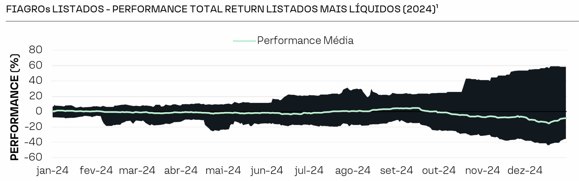 Por fim, a indústria de FIAGROs listados apresentou grande dispersão de retornos. Os retornos dos FIAGROs listados apresentaram uma alta dispersão ao longo de 2024, explicado em parte pelo cenário de volatilidade de juros, mas também pelo fato de que a piora no cenário macro afetou diretamente a capacidade de pagamento dos produtores rurais nos veículos com foco em crédito. Além disso, a queda nos preços das commodities e um ambiente regulatório que permitiu a postergação de obrigações também impactaram essa dinâmica. Apesar do agronegócio ser resiliente, diversas variáveis podem afetar a produtividade do produtor rural, e consequentemente, sua capacidade de repagamento. Isso fez ~55% dos FIAGROs listados negociarem com mais de 20% de desconto vs. valor patrimonial, apesar de entregarem yields ~16%.