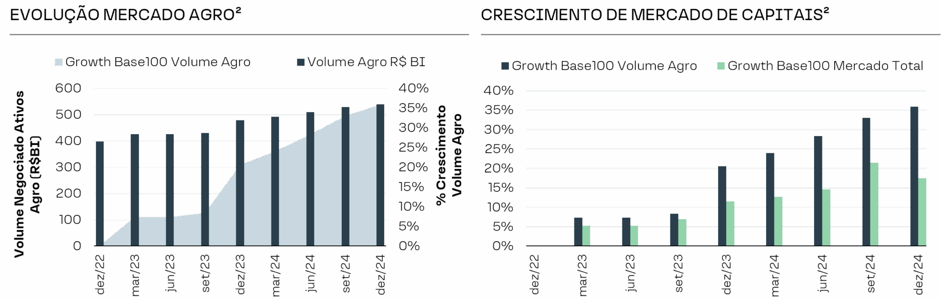 Conforme exposto abaixo, o agronegócio cresceu 35% em volume financeiro entre 2022 e 2024 (vs. 17% para o total do mercado de capitais), atingindo mais de R$ 500 bilhões.