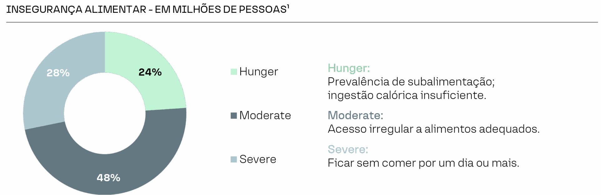 Em 2023, 733 milhões de pessoas enfrentaram a fome e 2,33 bilhões sofreram insegurança alimentar moderada ou grave. Dentre elas, mais de 864 milhões vivenciaram insegurança alimentar grave, passando um dia inteiro ou mais sem acesso a qualquer alimento¹.