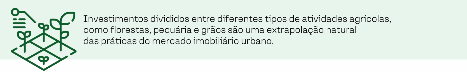Além disso, acreditamos que tendem a estar mais bem alinhadas aos ciclos de valorização do setor e menos suscetíveis ao risco de crédito e a eventuais renegociações forçadas. Em cenários de estresse, o investidor de terra participa diretamente da geração de valor do ativo subjacente, o que pode conferir maior resiliência frente a alterações negativas do perfil de crédito das contrapartes. A natureza do veículo torna-se diferente para o investidor, no sentido de que o FIAGRO passa a ser focado numa tese de ganho de capital e não de dividendos.