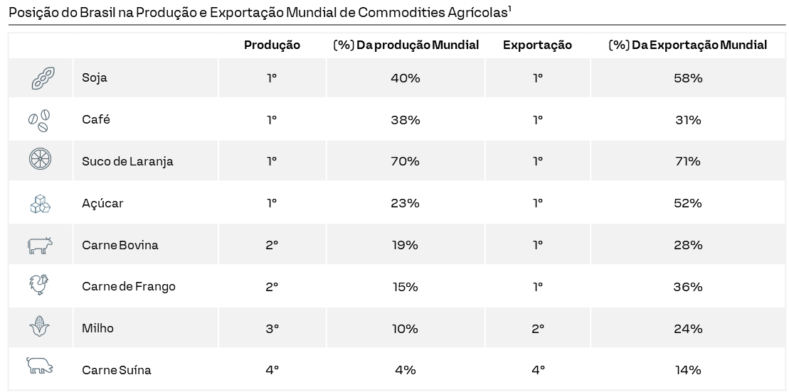 Nesse contexto, o Brasil é protagonista nos mercados internacionais de soja, milho, carnes bovina, suína e de frango, açúcar, café e suco de laranja, liderando ou figurando entre os maiores exportadores globais desses produtos – alimentando cerca de 1 bilhão de pessoas no mundo².