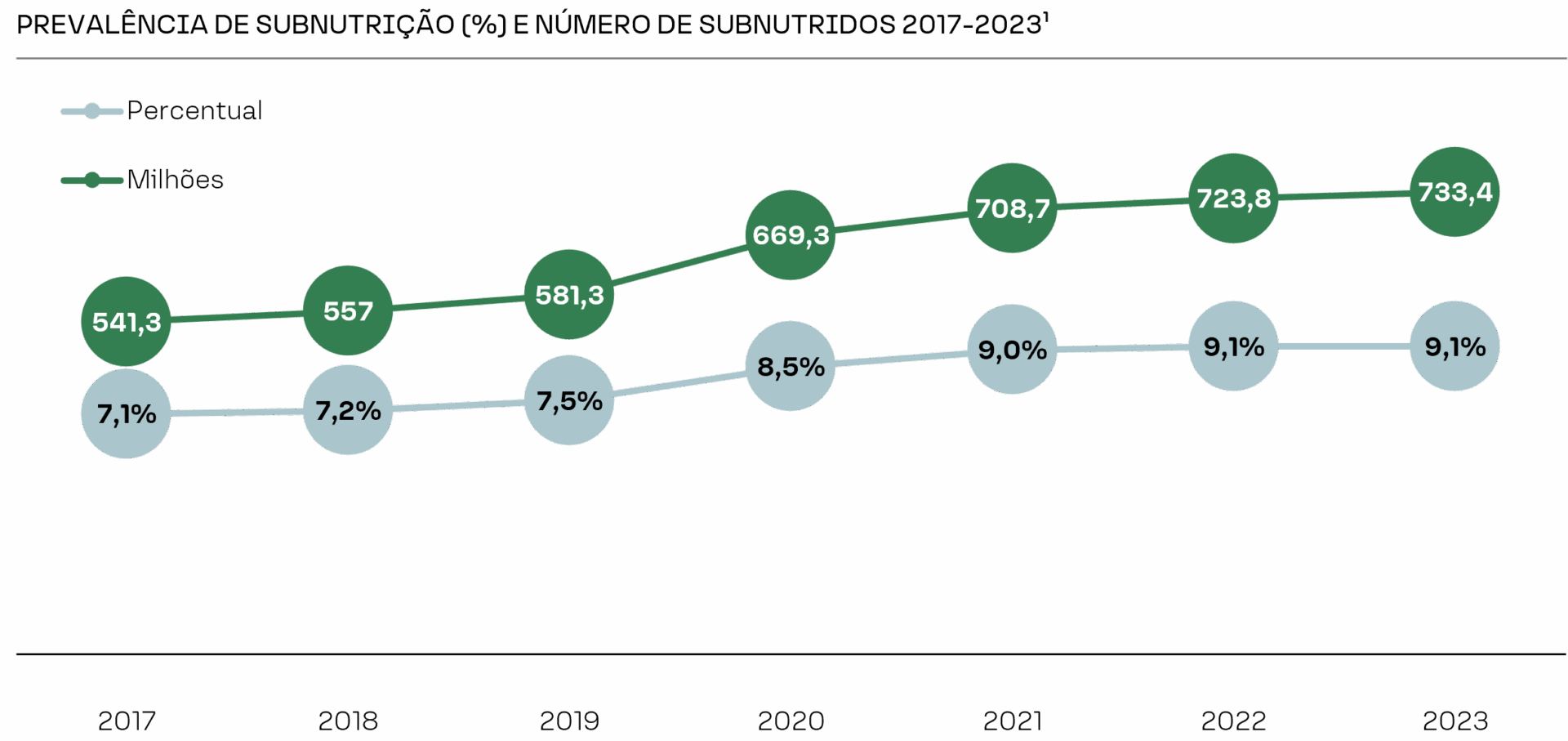 O gráfico a seguir demonstra como a subnutrição global aumentou acentuadamente de 2019 a 2021 e persistiu no mesmo nível até 2023: