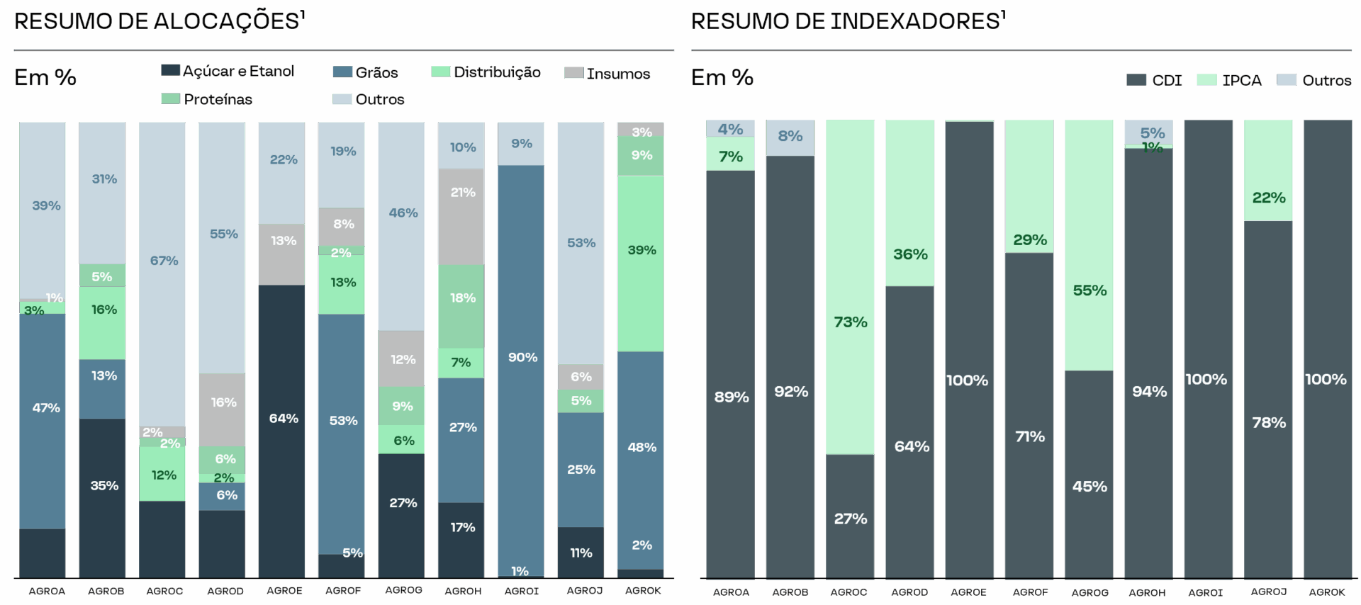 Em termos de exposição setorial, as principais alocações dos FIAGROs listados estão em grãos e açúcar & etanol. Isso reflete a natureza do agro brasileiro, dado que o país atualmente é o maior exportador de açúcar e um dos maiores exportadores de commodities agrícolas no mundo. Além disso, as operações investidas pelos FIAGROs têm o CDI como principal indexador, em grande parte explicado pelo foco do veículo em investidores gerais e qualificados que tendem a preferir a indexação dos seus investimentos em CDI vis-à-vis o IPCA.