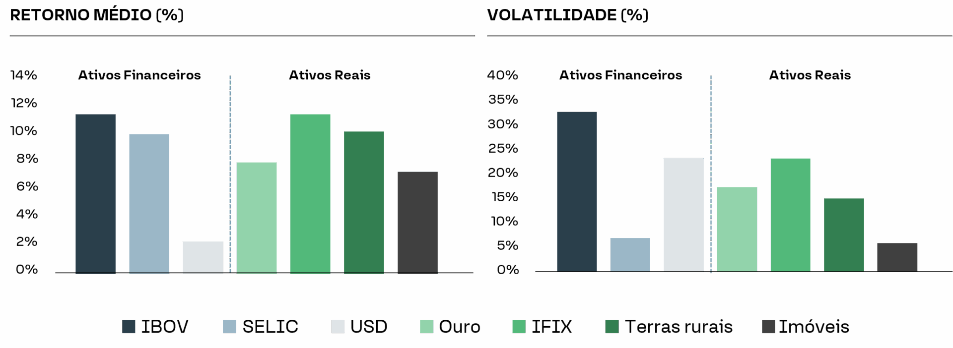Ativos reais no Brasil combinam baixa volatilidade (próxima à Selic) com retornos de longo prazo que rivalizam a Bolsa e superam a renda fixa. A análise histórica dos diferentes tipos de ativo demonstra que os ativos reais (principalmente imóveis residenciais e rurais) no Brasil apresentam ao longo dos últimos 20 anos uma volatilidade muito mais baixa comparada a outras classes de ativos, como ações, moedas, IFIX (índice dos fundos imobiliários listados). Em contrapartida, seus retornos médios no mesmos períodos foram de 3 a 4 vezes o retorno de ativos de renda fixa, com destaque para terras rurais que apresentaram ganhos equivalentes ao do índice Bovespa, tendo como média um CAGR de 11%.