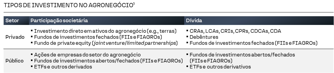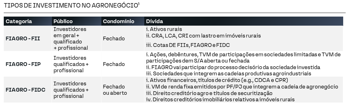 Atualmente é possível investir no agronegócio no setor público e privado via instrumentos de equity (participação societária) ou dívida, com os FIAGROs alavancando o financiamento do setor de forma eficiente e sendo divididos em três tipos principais: i) FIAGRO-FII; ii) FIAGRO-FIP; e iii) FIAGRO (FIDC). Abaixo detalhamos os tipos de FIAGROs e os ativos centrais de cada tipo de veículo.